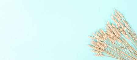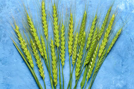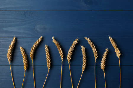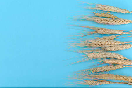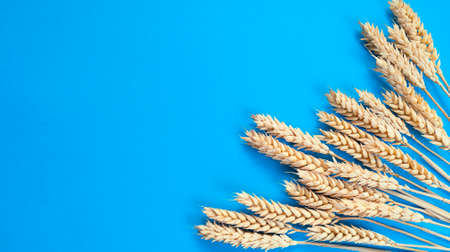 Spikelets of wheat on a blue background. Simple flat lay with copy space. Stock photo.
