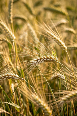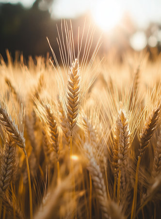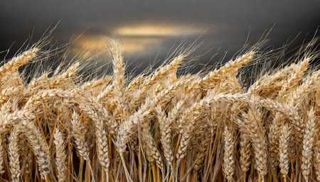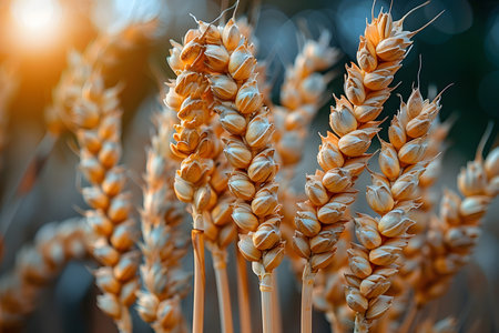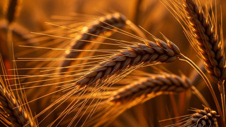 A detailed close-up captures the texture and golden hues of wheat stalks swaying gently in a field during sunset. Warm sunlight bathes the scene, highlighting the individual grains and delicate awns of the wheat ears. The shallow depth of field creates a soft, blurred background, emphasizing the natural beauty and abundance of the harvest. evokes feelings of warmth, nature, and the bounty of agriculture.