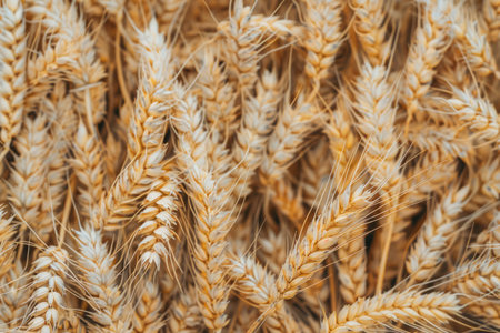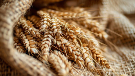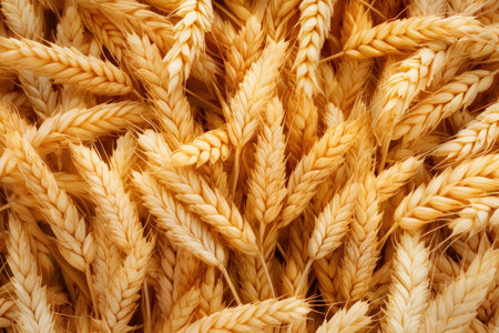 This close-up shot features a cluster of ripe wheat stalks, showcasing their golden color and intricate textures. The wheat appears bunched together, with individual grains visible on the stalks. The image conveys the essence of a bountiful harvest.