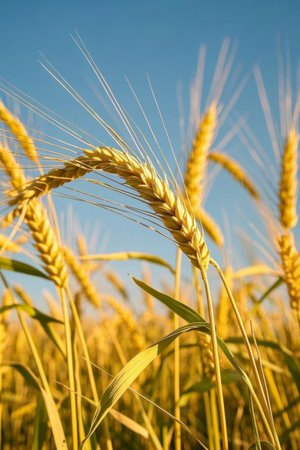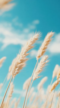 Golden wheat stalks swaying gently against a vibrant blue sky in a serene summer field.