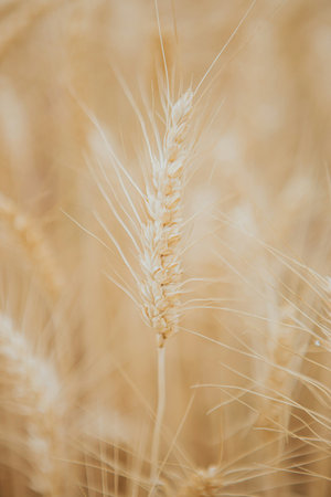 Ears of golden wheat on the field. Shallow depth of field