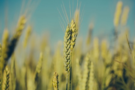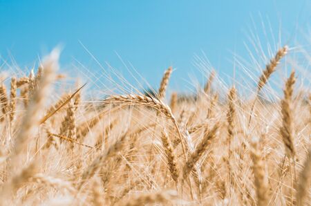 gold ears of wheat against the blue sky soft focus, closeup, agriculture background