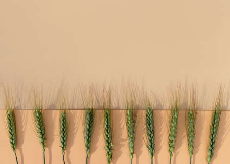 Row of green wheat spikelets on a beige background with shadow. Harvest creative concept.