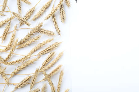 Ripe wheat ears on a white background. Autumn harvest concept, place for text.