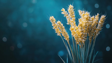 Blue paper background with ears of wheat on one side.