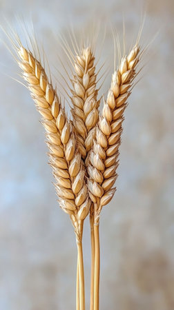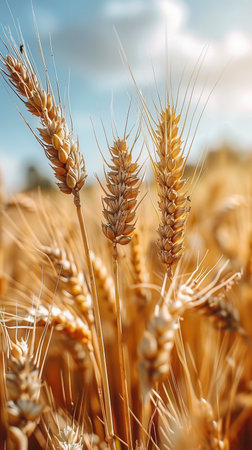 This close-up captures the intricate details of several golden wheat ears swaying gently in the warm sunlight. The stalks and individual grains are rendered in rich shades of yellow and brown, illuminated by a soft, golden light that creates a serene and peaceful atmosphere. The shallow depth of field blurs the background, emphasizing the texture and form of the wheat. evokes a sense of harvest, agriculture, and the natural beauty of a sun-drenched field.
