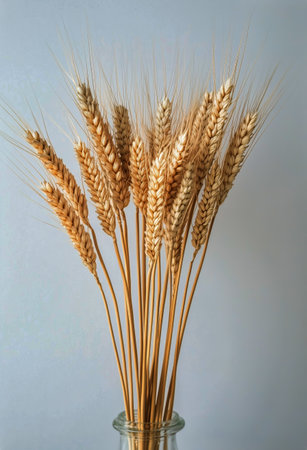 Dry wheat ears arranged on a clean white background, creating a natural and minimalist composition representing harvest, agriculture, and healthy nutrition concepts