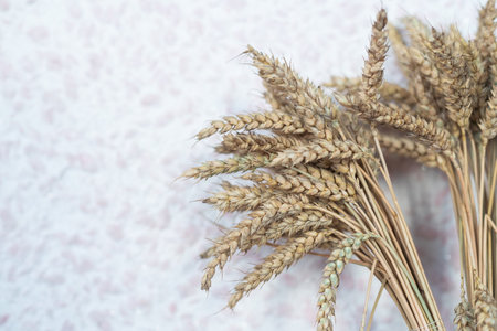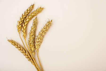Close up top view mockup template ears of ripe wheat on a light background. Background. Selective focus.