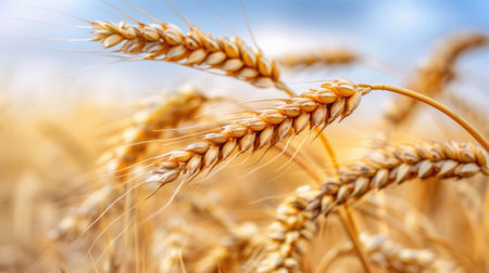 Close-up image of wheat stalks in a field, emphasizing the golden hues and details of the heads of grain. The sky is a pale light blue, suggesting a sunny day.