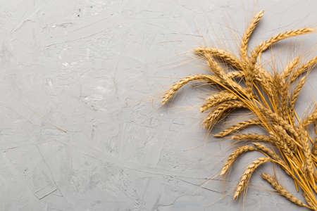 Sheaf of wheat ears close up and seeds on colored background. Natural cereal plant, harvest time concept. Top view, flat lay with copy space. world wheat crisis.