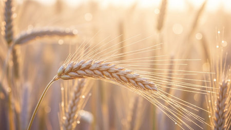 A detailed macro shot focuses on a single golden wheat ear, its delicate awns catching the warm glow of the morning sun. Tiny dew drops sparkle on the grains and stalk, adding a touch of freshness and natural beauty. The background is softly blurred, creating a serene bokeh effect with more wheat stalks visible, emphasizing the vastness of the field.