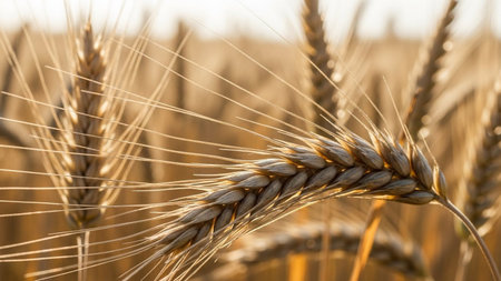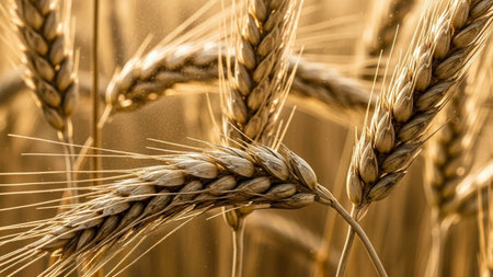 Close-up view of golden wheat ears bathed in sunlight, showcasing the intricate details and textures of the crop. ideal for use in agricultural, nature-themed designs, and stock photography collections focusing on harvest and farming. Generative AI