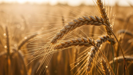 A close-up view of golden wheat stalks in a sunlit field at dawn. The stalks are and ready for harvest, with their grains catching the warm, golden light of the rising sun. Tiny dew drops glisten on the stalks and leaves, adding a delicate sparkle. The background is softly blurred with a bokeh effect, emphasizing the intricate details of the wheat. The evokes a sense of abundance, natural beauty, and the quiet serenity of the countryside at the start of a new day.