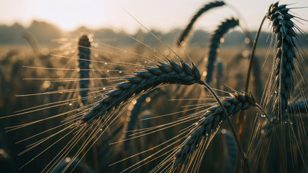 A close-up macro view captures the delicate beauty of wheat stalks glistening with dew drops at sunrise. The golden light of dawn illuminates the field, creating a warm and serene atmosphere. Sun rays filter through the stalks, casting long shadows and creating a soft bokeh effect in the background. The highlights the intricate details of the wheat heads and the tiny water droplets, evoking a sense of natural tranquility and the promise of harvest.