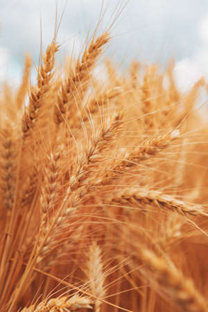 Golden wheat spikelets on field ripe crop before harvesting on summer day on blue sky background