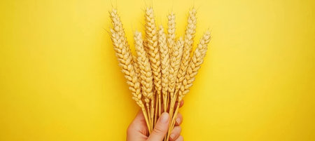 Male Hand Touching Ripe Golden Wheat Ears, Yellow Background, Harvest Time, Agriculture