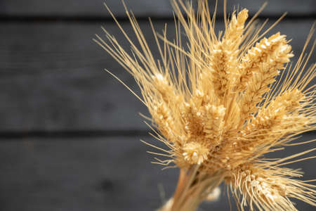 spikelets of dry wheat in a bunch on a black wooden table, wheat place for text