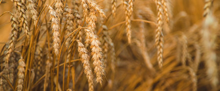 Dry golden wheat spikes on sunny day ready for harvest