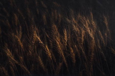 A close-up view of several golden wheat stalks, showcasing their intricate details and rich color, creating a striking contrast with the dark, abstract backdrop.