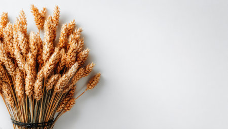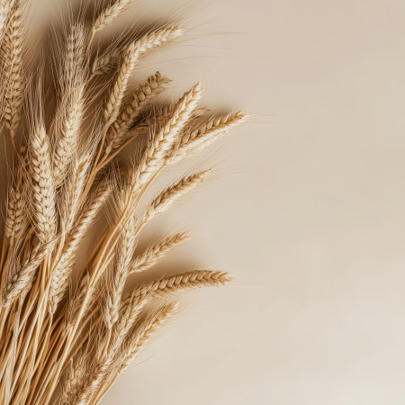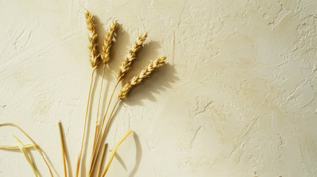 Dried wheat stalks are elegantly laid out against a neutral light backdrop showcasing their natural texture and golden hues during daytime.