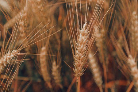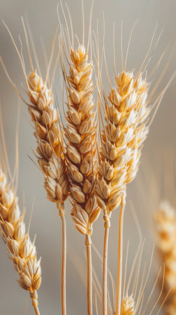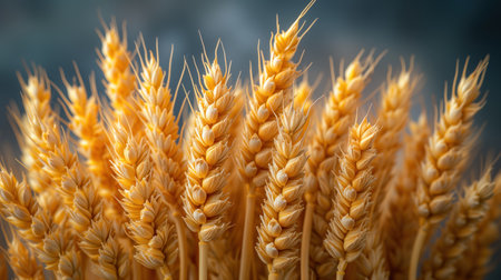 This is an extreme close-up of several ripe, golden wheat stalks. The focuses on the intricate details of the grain heads and the fine, straw-like texture of the stalks. The color palette is dominated by warm, golden-brown hues, highlighting the ripeness and natural beauty of the wheat. The shallow depth of field blurs the background, the viewer's attention to the sharp details of the wheat. evokes a sense of harvest, agriculture, and the raw ingredients of food production.