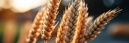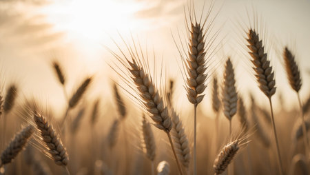 Golden wheat ears shining in sunlit field, embodying rustic agricultural beauty and abundance