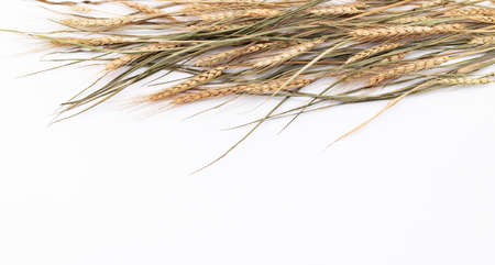 Wheat on a white background close-up mock up. Wheat harvesting season, harvest festival. Copy space