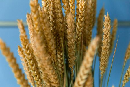 Golden, yellow wheat in a vase on a blue background