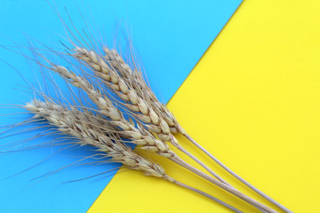 On a yellow-blue background lies a small bunch of wheat.