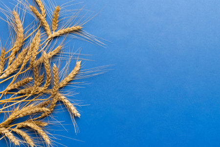 Close-up of spikelets of wheat on a blue background.