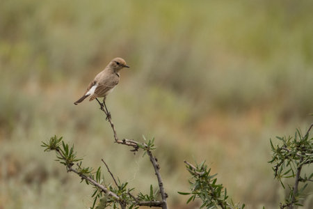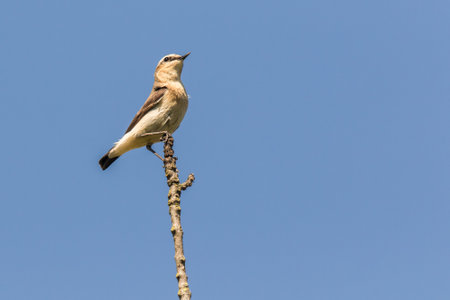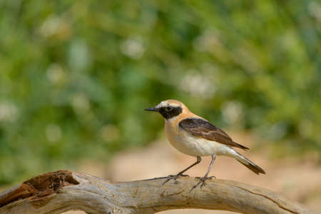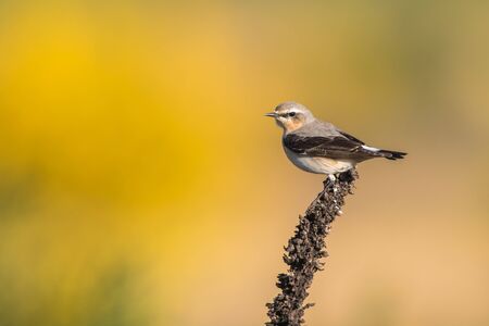 Young Northern Wheatear sitting on a branch on a beautiful background. Oenanthe oenanthe