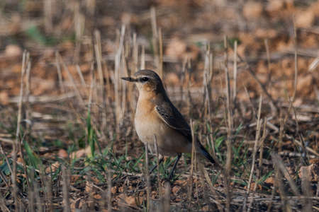 Northern wheatear Oenanthe oenanthe male. Bird is sitting in the burnt grass.