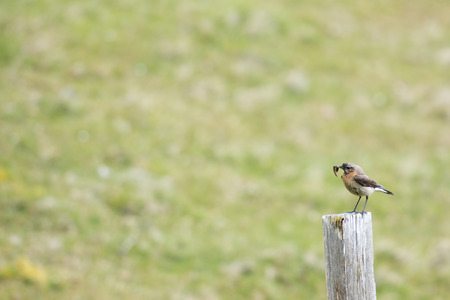 female Oenanthe oenanthe with caterpillars in beak sitting on a pole