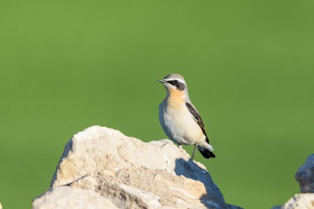 A northern wheatear Oenanthe oenanthe perches on a rock, its form outlined against a distant green backdrop. The natural light accentuates its delicate features and subtle colors.