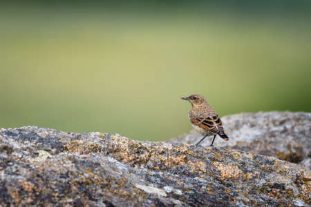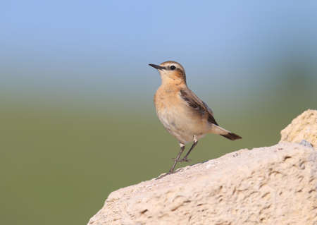 Wildlife photography. Young passerine bird of northern wheatear (Oenanthe oenanthe) on green nature background