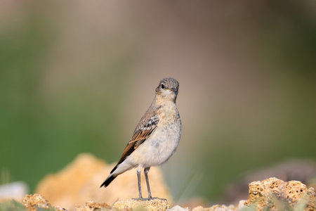 Close up of a juvenile Northern wheatear (Oenanthe oenanthe) perched on a rock against green background in summer, Scotland, UK.