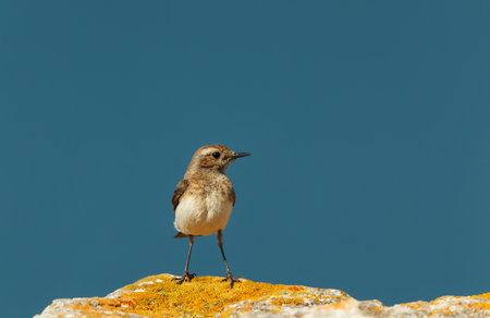 The northern wheatear or wheatear (Oenanthe oenanthe) female stands on a rock against the blue sky
