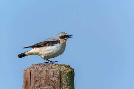 A northern wheatear (Oenanthe oenanthe) male in breeding plumage stands on a stone on blue sky bakground