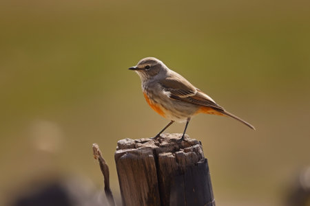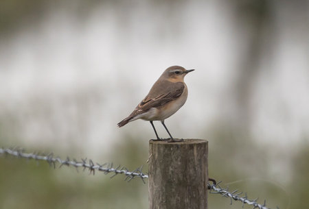 A selective focus shot of an Isabelline wheatear bird perched on the fence