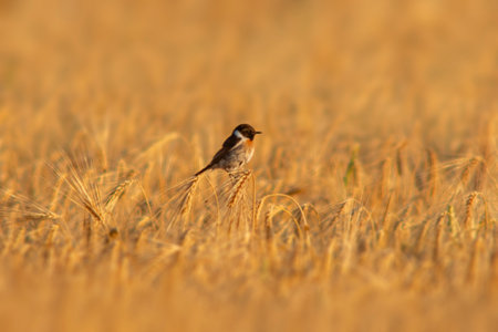 a Stonechat (Saxicola rubicola) sits on the ears of a wheat field and searches for insects