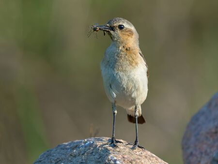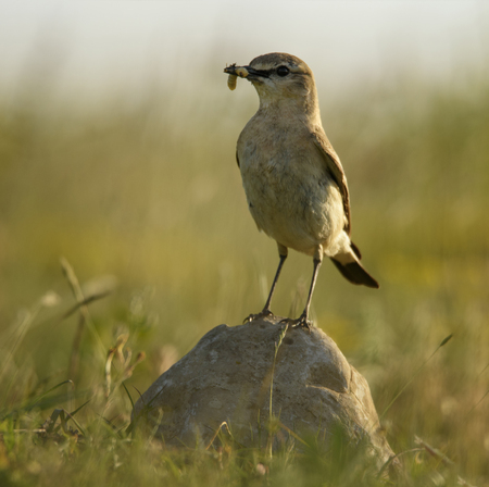 isabelline wheatear (Oenanthe isabellina) stands on rock with prey in beak.