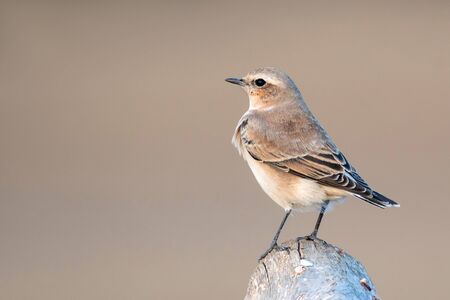 Close up view on a female whinchat (Saxicola rubetra) on the blurred beige background