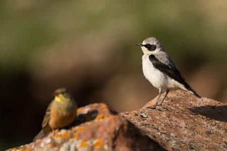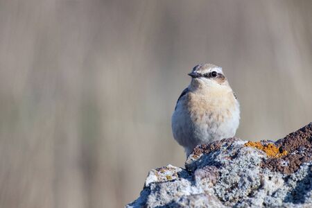 Northern wheatear or Oenanthe Oenanthe spring small bird migration sitting on the rock soft background.