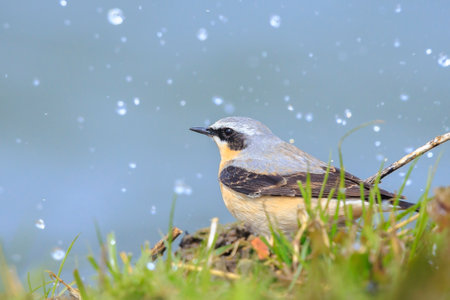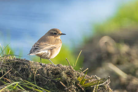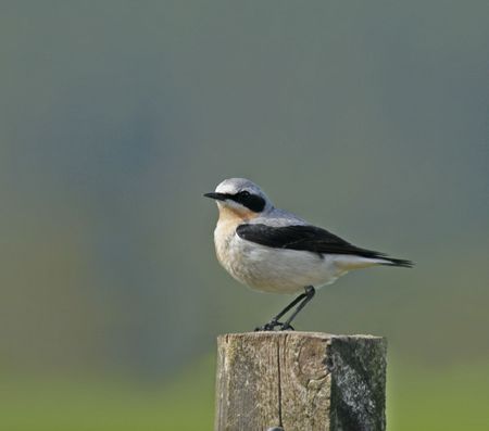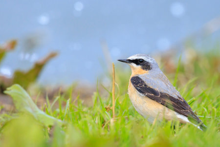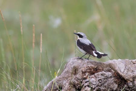 Northern wheatear Oenanthe oenanthe male on blurred background.