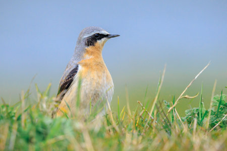 Closeup of a Northern wheatear bird male, Oenanthe oenanthe, foraging in a field of grass