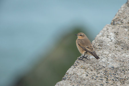 Northern Wheatear (Oenathe oenathe) female perched on a pier in a harbour