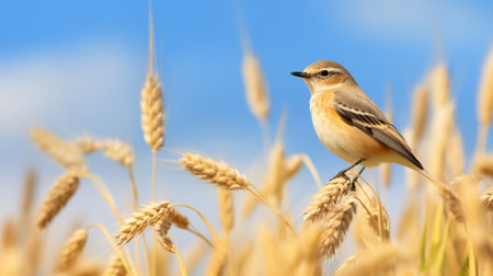 A common wheatear (Phoenicurus schoenicurus) perched in a wheat field.