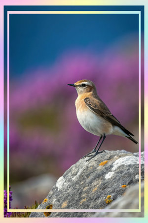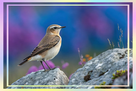 A female Eastern wheatear perched on a rock with a pink and purple background.