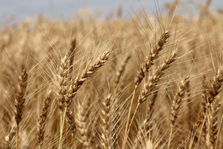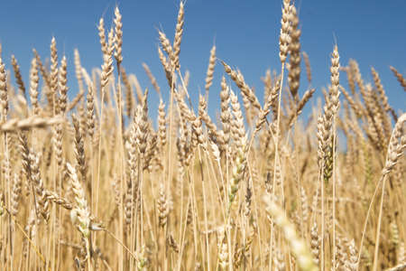 gold ears of wheat against the blue sky soft focus, closeup, agriculture background