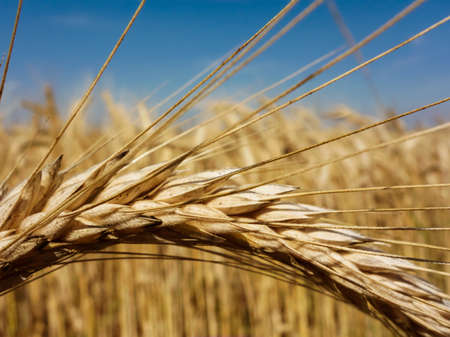 Golden wheat spikelets on field ripe crop before harvesting on summer day on blue sky background